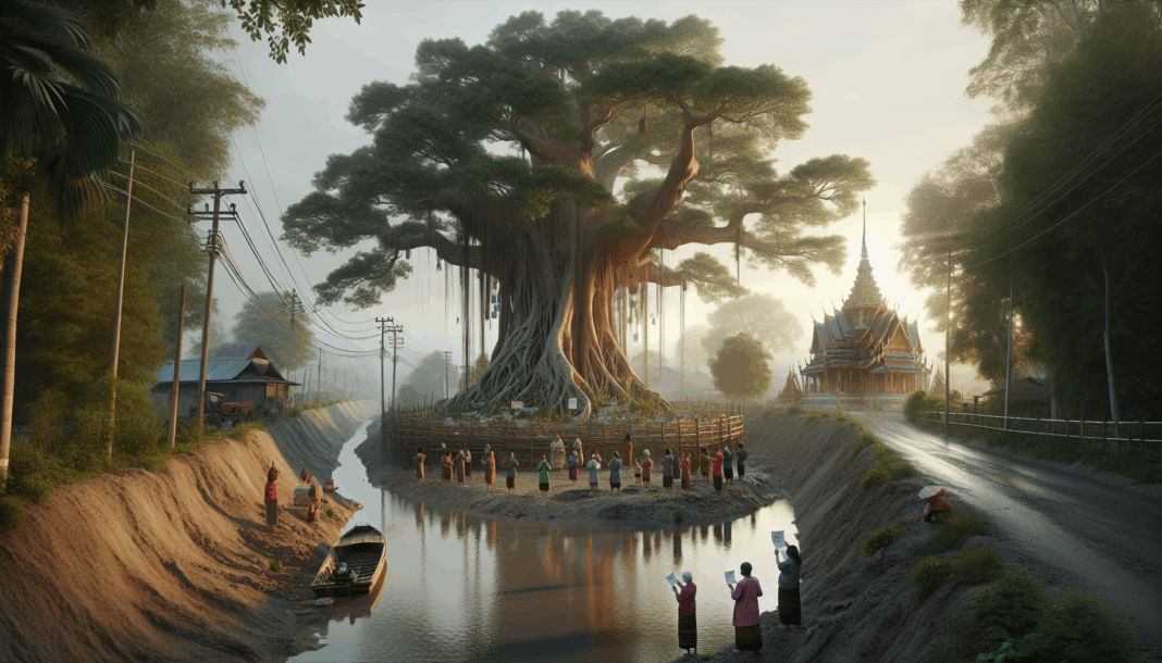 ตามรายงานจากข่าวสด พบว่าชาวบ้านในตำบลแม่กาได้พบต้นตะเคียนทองขนาดใหญ่ที่จมอยู่ในคลองลึก โดยมีลักษณะเป็นต้นไม้ที่มีอายุมากกว่า 200 ปี ซึ่งเป็นที่เคารพของชาวบ้านในพื้นที่มานาน เมื่อมีการขุดลอกคลองเพื่อปรับปรุงเส้นทาง น้ำก็ไหลออกทำให้เห็นต้นตะเคียนชัดเจนยิ่งขึ้น ร่างทรงในพื้นที่ได้มาชี้จุดและบอกว่าต้นตะเคียนทองนี้ต้องการจะขึ้นจากน้ำ ทำให้มีการขุดลึกลงไปจนพบต้นตะเคียนที่มีลำต้นใหญ่มาก